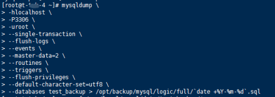 mysqldump \-hlocalhost \-P3306 \-uroot \--single-transaction \--flush-logs \--events \--master-data=2 \--routines \--triggers \--flush-privileges \--default-character-set=utf8 \--databases test_backup > opt/backup/mysql/logic/full/`date +%Y-%m-%d`.sql