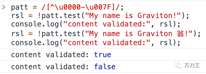 patt = [^\u0000-\u007F]/;rsl = !patt.test("My name is Graviton!");console.log("content validated:", rsl);rsl = !patt.test("My name is Graviton 翁!");console.log("content validated:", rsl);