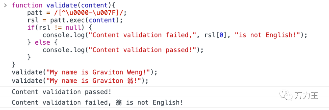function validate(content){patt = /[^\u0000-\u007F]/;rsl = patt.exec(content);if(rsl != null) {console.log("Content validation failed, ", rsl[0], "is not English!");} else {console.log("Content validation passed!");}}validate("My name is Graviton Weng!");validate("My name is Graviton 翁!");
