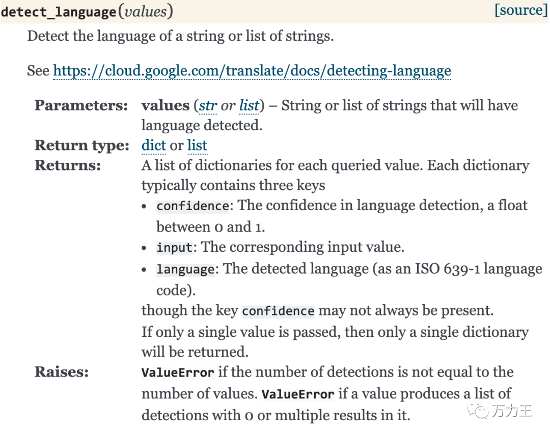所以,如果家里有矿(因为要收费),推荐可以使用Google Cloud API的Translation API中的detect_language()方法,这里是python版的文档地址https://googleapis.dev/python/translation/latest/index.html: