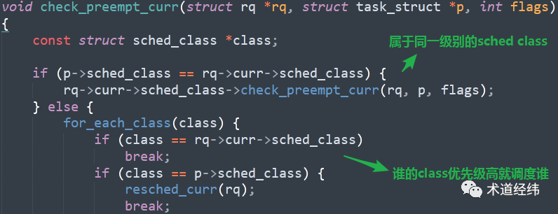 这里的 "for_each_class" 看起来只是一个链表遍历,但由于 sched class 的链表隐含了优先级的关系,所以被唤醒的任务、和当前正在运行的任务,谁所属的 "sched_class" 更早被遍历到,说明谁的优先级更高,高优先级的 class 自然可以抢占低优先级的 class(比如 RT 任务抢占 CFS 的任务)。