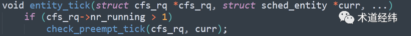 由于主流的 Linux 版本默认没有使能 "nohz_full" 模式,即便 runqueue 上只有一个 runnable 的任务,tick 依然会发生,所以在tick到来时,需要检查下 runnable 的任务数量,大于 1 才存在切换的必要。