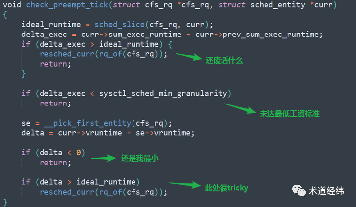 那怎么判断当前任务应该被抢占(让出CPU)呢?依据主要其是实际的运行时间(以"delta_exec"表示),以及其应该运行的时间(就是前面介绍过的 "ideal_runtime")。