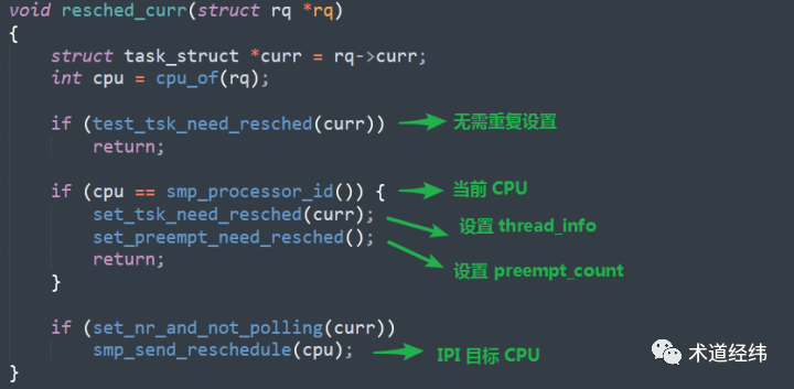 前者由 per-CPU 的 preempt_count 变量决定,即在 atomic 上下文不能执行调度,而后者取决于 TIF_NEED_RESCHED 标志位。该标志位被设定后,意味着当前有更值得(应该)运行的任务,当下一个调度时机出现时,就会检查这个标志位,并执行调度。