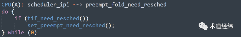 当 CPU(A) 收到这个通知后,自己把 "need schedule" 标志位从 thread_info 拷贝一份到 preemption count 中。最终的结果就是:既方便了调度条件的判断,也避免了 lock 的开销。