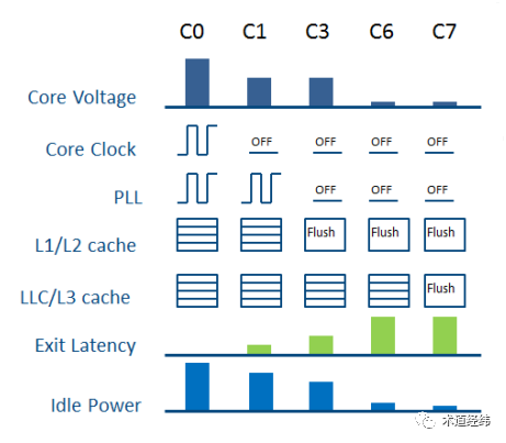 为此,CPU的设计者在硬件层面提供了不同的运行模式,以Intel的芯片为例(同时也是ACPI 的spec定义),包括了P-state和C-state。