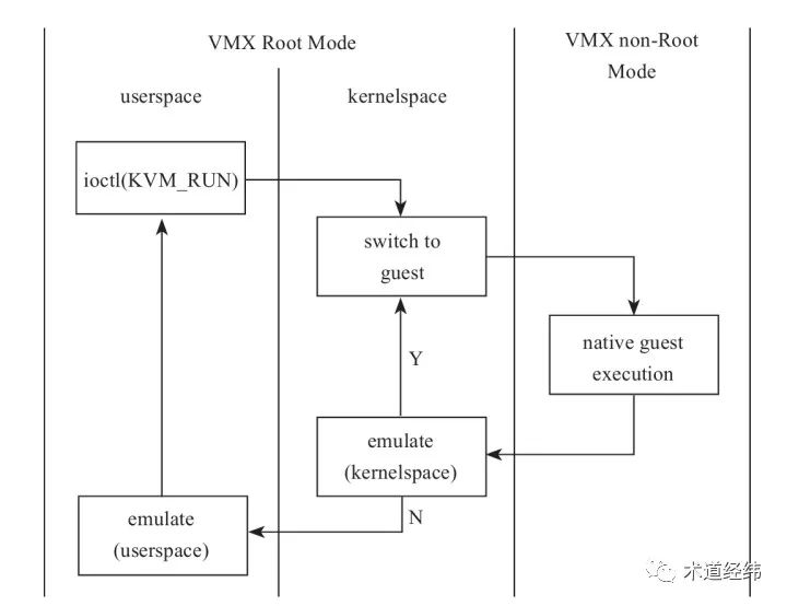 当guest中的driver试图访问host中的device时,会通过一定的方式触发vm-exit,从non-root模式的ring 0/3切换到root模式的ring 0,即从guest kernel“陷”入host kernel。如果host kernel不能对这个设备进行emulate,就转给host上的userspace(root模式的ring 3)。