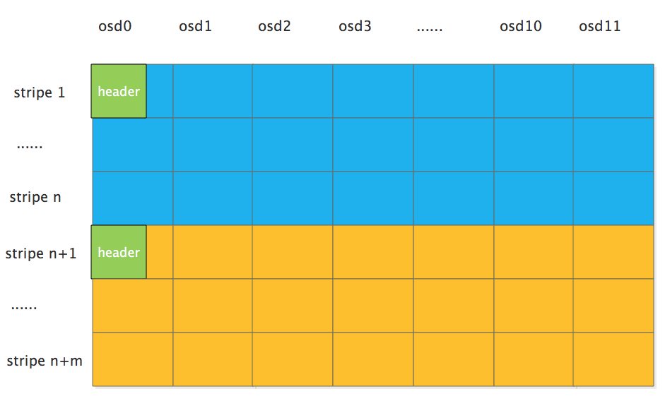 而执行 rewrite 的过程需要通过 Ceph read 接口将 oid1 块上的上层对象信息反序列化出来(header 中的 bucket-name 和 object-name),而按照下图的结构布局,则需要将整个条带的内容读出来(读放大严重)
