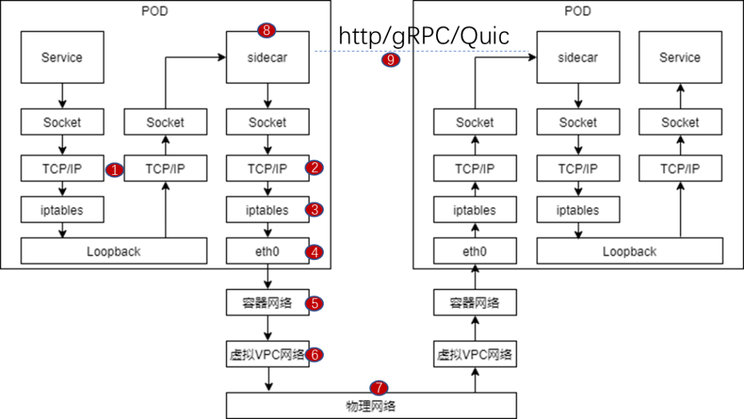 ⑧是sidecar自身转发逻辑,以目前业界比较流行的Envoy为例,这块本身转发逻辑的优化空间不大,在10%以内;