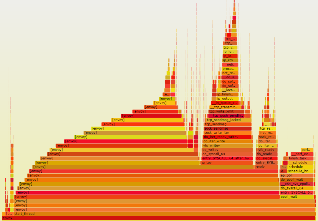 ②③④即为协议栈的优化。容器分为业务容器和sidecar容器,对于计算节点,一般会运行在同一个POD内。容器中的应用依赖于socket接口进行通信,目前底层都是基于内核的TCP/IP协议栈,内核和用户态的频繁切换会带来性能开销,同时内核协议栈处理本身也会占用CPU资源。下图中以fortio测试场景看Envoy CPU占比,通过火焰图可以看出该场景下内核协议栈占比将近50%,基本上和Envoy本身转发逻辑对半分。