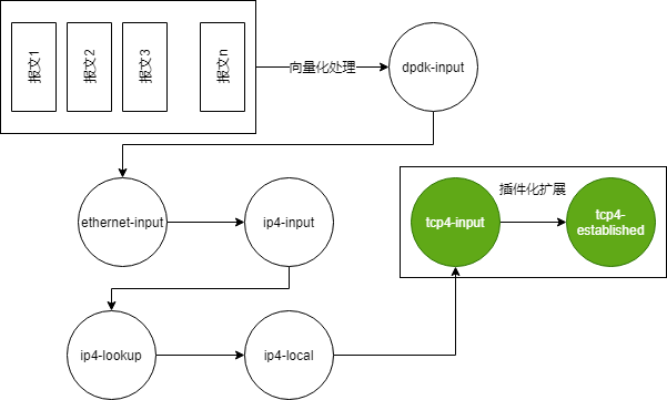 VPP平台是通过graph node串联起来形成一条datapath来处理报文,可以通过插件的形式引入新的graph node或者重新排列报文的graph node。将插件添加到插件目录中,运行程序的时候就会自动加载插件。VPP平台可以用于构建任何类型的报文处理应用,比如负载均衡、防火墙、IDS、主机栈。