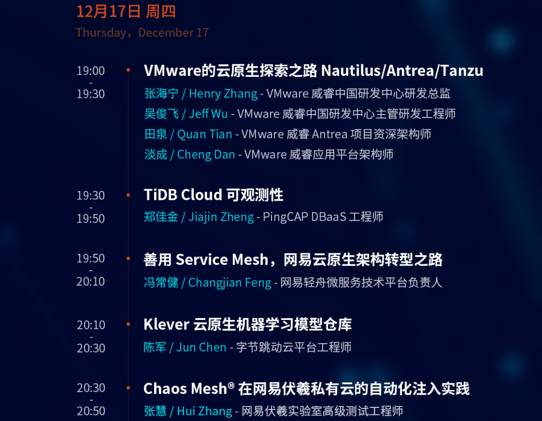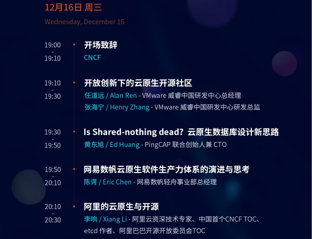 2020年12月16-17日,来自CNCF、VMware、PingCAP、网易数帆、阿里云等17位重磅演讲嘉宾,带来2天主题分享,立体化解析云原生前沿技术与实践。活动详情如图,名额有限,欢迎左下角“阅读原文”,或识别图中二维码报名。