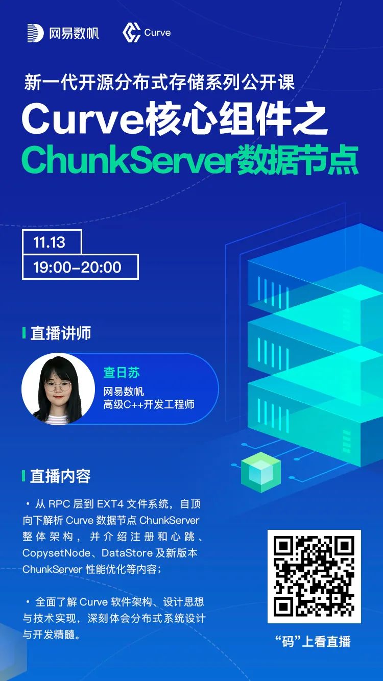技术分享预告:网易数帆 Curve 核心开发团队将带来精心准备的 新一代开源分布式存储 - Curve 技术系列公开课(直播+回放),每周五晚19:00为大家揭开 Curve 技术的奥妙及 Curve 社区的规划,本周五为 ChunkServer 数据节点的主题,敬请点击左下角“阅读原文”或识别下图二维码收看!