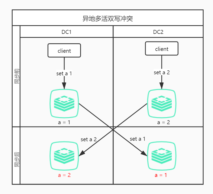 DC1写入set a 1,同时DC2写入set a 2,当这两条命令通过同步工具同步到对方机房时,导致最终DC1中保存的a为2,DC2中保存的a为1,也就是说两个机房最终数据不一致。