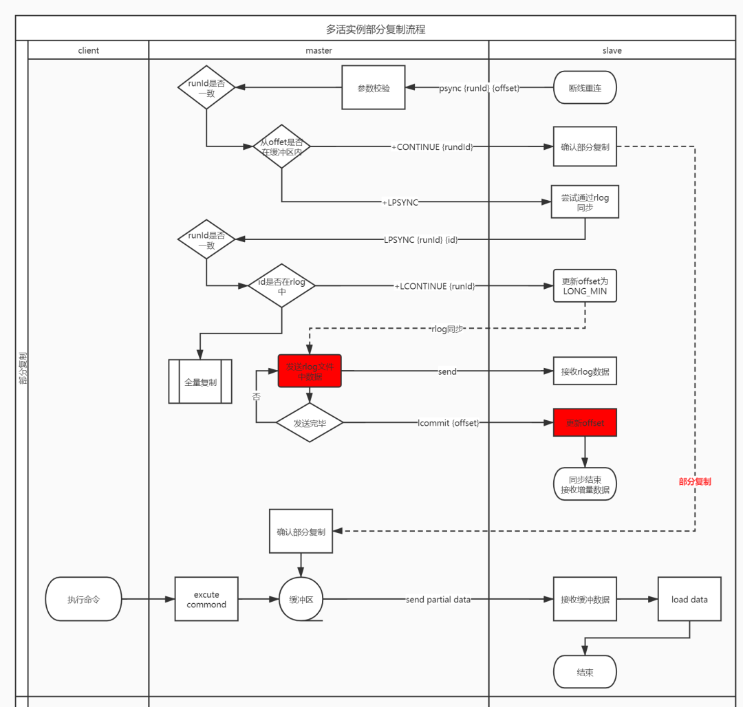 如前所述,为了容忍更长时间的机房级故障,提高跨数据中心容灾能力,提升机房间故障恢复效率,我们对redis同步流程进行改造,当部分同步中无法使用环形复制缓冲区完成同步时,增加先尝试使用日志rlog进行同步,流程图如下所示:
