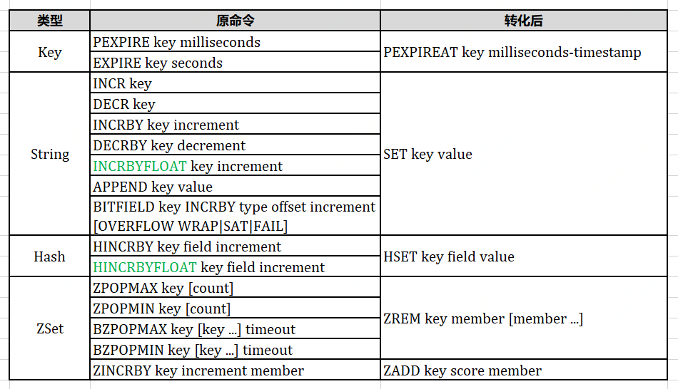 为了保证redis命令具备幂等性,对redis中部分非幂等性命令进行了改造,具体设计改造的命令如下所示: