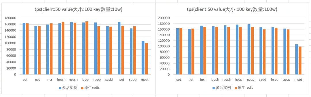 经测试,redis多活实例(默认开启rlog日志),相对于原生redis实例(开启aof持久化)性能基本一致;如下图所示: