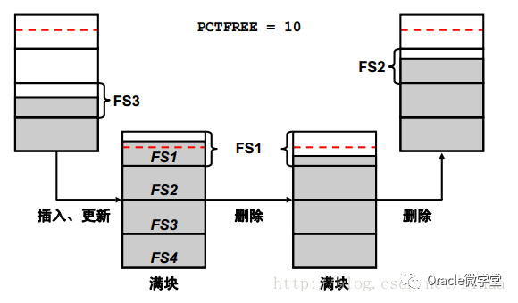 在示例中,左侧的块是一个FS3 块,因为其空闲空间介于50% 和75% 之间。执行了一些插入和更新语句后,将达到PCTFREE(虚线处),并且不能再向该块中插入新行。