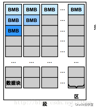 自动空间管理段具有一组位图块(BMB),用于描述该段中数据块的空间使用情况。BMB 以树形层次结构组织。层次的根层存储在段头部中,其中包含对所有中间层BMB 的引用。