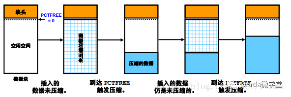 这样一来,可以在同一块中插入新的未压缩数据,直到再一次达到PCTFREE设置规定的填满标准。此时,会再一次触发压缩以减少块中的已使用空间量。