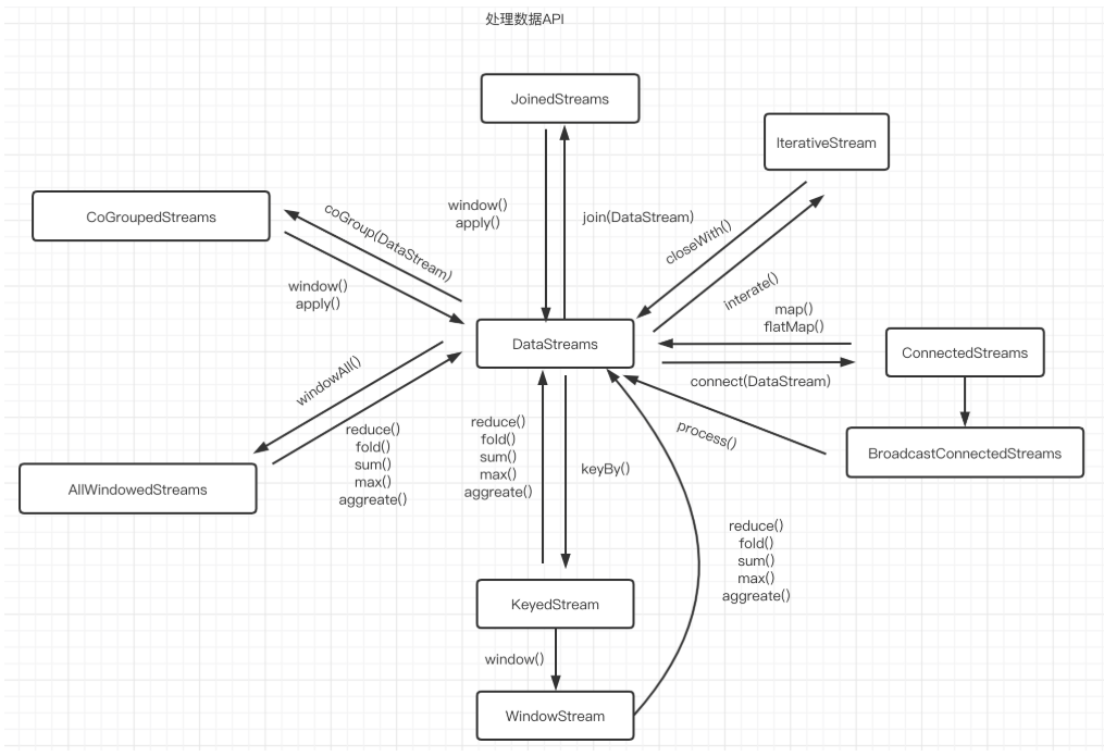 DataStream(每个DataStream都有一个Transformation对象) DataStreamSource(DataStream的起点) DataStreamSink(DataStream的输出) KeyedStream(表示根据指定的Key记性分组的数据流) WindowdeStream & AllWindowedStream(根据key分组且基于WindowAssigner切分窗口的数据流) JoinedStreams & CoGroupedStreams JoinedStreams底层使用CoGroupedStreams来实现 CoGrouped侧重的是Group,对数据进行分组,是对同一个key上的两组集合进行操作 Join侧重的是数据对,对同一个key的每一对元素进行操作 ConnectedStreams(表示两个数据流的组合) BroadcastStream & BroadcastConnectedStream(DataStream的广播行为) IterativeStream(包含IterativeStream的Dataflow是一个有向有环图) AsyncDataStream(在DataStream上使用异步函数的能力)