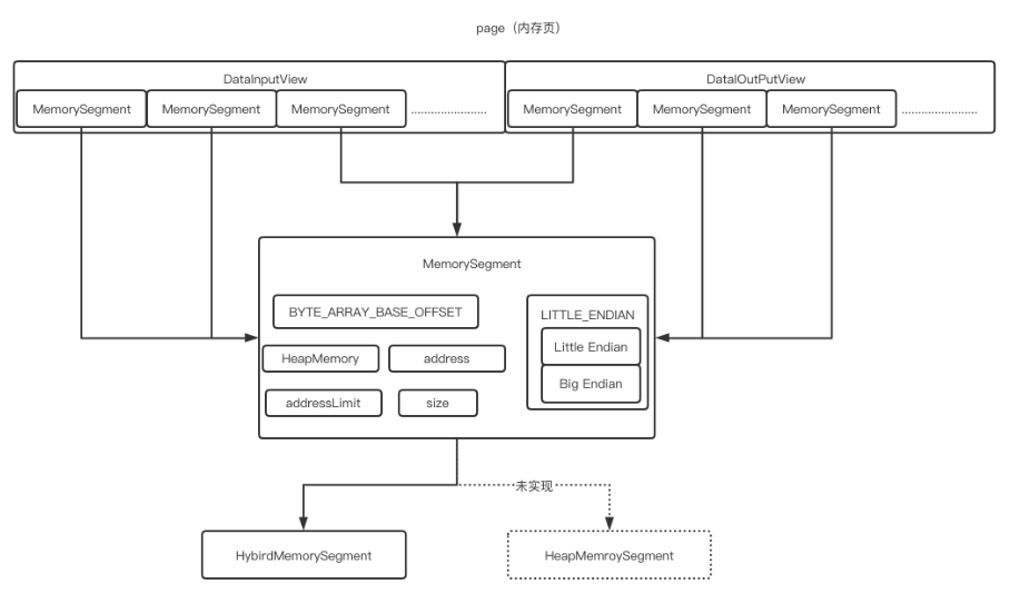 HybirdMemorySegment:用来分配堆上和堆外内存和堆上内存,Flink 在实际使用中只使用了改方式。原因是当有多个实现时,JIT无法直接在编译时自动识别优化 HeapMemorySegment:用来分配堆上内存,实际没有实现