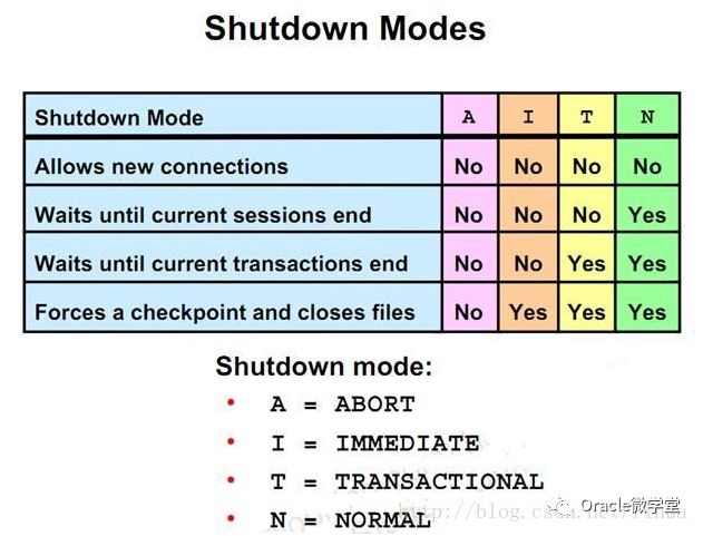Oracle DB在shutdown时可选择关闭模式:NORMAL、TRANSACTIONAL、IMMEDIATE或ABORT