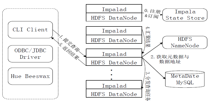 第0步,当用户提交查询前,Impala先创建一个负责协调客户端提交的查询的Impalad进程,该进程会向Impala State Store提交注册订阅信息,State Store会创建一个statestored进程,statestored进程通过创建多个线程来处理Impalad的注册订阅信息。 第1步,用户通过CLI客户端提交一个查询到impalad进程,Impalad的Query Planner对SQL语句进行解析,生成解析树;然后,Planner把这个查询的解析树变成若干PlanFragment,发送到Query Coordinator. 第2步,Coordinator通过从MySQL元数据库中获取元数据,从HDFS的名称节点中获取数据地址,以得到存储这个查询相关数据的所有数据节点。 第3步,Coordinator初始化相应impalad上的任务执行,即把查询任务分配给所有存储这个查询相关数据的数据节点。 第4步,Query Executor通过流式交换中间输出,并由Query Coordinator汇聚来自各个impalad的结果。 第5步,Coordinator把汇总后的结果返回给CLI客户端。