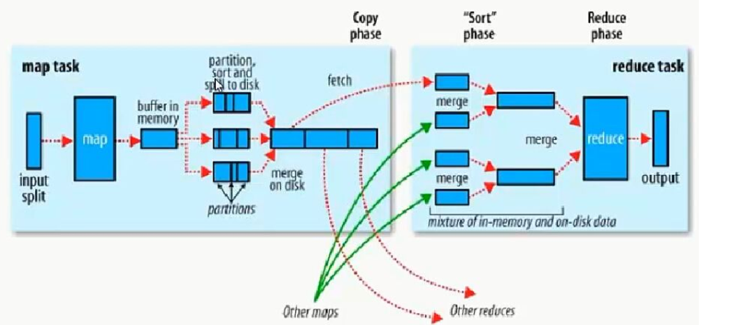接下来,我们详细的了解下MapReduce的过程,在map阶段,主要任务是处理从HDFS中输入的文件,在输入时会使用InputFormat类的子类(TextInputFormat)把输入的文件(夹)划分为很多切片(InputSplit),默认HDFS的每一个block块对应着一个切片,每一个切片默认大小为128MB,每一个切片会产生一个map任务。然后当map任务处理完后(就会进入到shuffle(中文译为“洗牌”)阶段,从map端的输出到reduce端的输入这一过程称为shuffle过程,该过程主要是负责map端的数据能够完整的发送到reduce端进行处理),就会将这些数据刷写到环形缓冲区(Buffer in mermory)中,环形缓冲区的默认大小位100MB,而当这些数据刷写到80%的时候,就会开始溢写到磁盘中去,那么溢写的过程中,会对数据进行分区(partition)和排序(sort)处理,然后每个map任务可能会产生多个(小)文件(这些小文件都采用了快速排序处理过),我们知道最后reduce任务会从map任务中拉取数据,对这些(小)文件进行拉取时会需要很多的网络IO以及磁盘IO的资源,那么,为了减少网络IO和磁盘IO的次数,我们会将多个(小)文件合并为一个(大)文件,该过程就是merge操作,使用hash partitional分区原理来分区,采用归并排序对分区中的数据排序,并且会根据map端中输入的key的不同去计算hash值,再去对指定的reduce的个数进行取余,reduce的个数是指提前设定好的,几个reduce(个数)就会产生几个分区,然而,相同的key的数据会进入到同一个reduce任务中,一个reduce任务中可以处理不同key的数据,因为不同数据key的hash值对reduce个数进行取余,最后得到的结果可能一样的,所以一个reduce任务中也有可能会有不同的key,最后每一个map任务会生成一个(大)文件,而这个(大)文件是经过分区和排序得到的,之后,会通过HTTP将每一个输出文件的特定分区的数据拉取到reduce任务中,等reduce任务阶段处理完后会将最终的结果写入到磁盘(也就是HDFS)中。