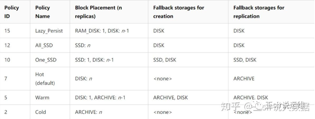 HDFS允许根据预测将不同的文件存储在不同的存储类型中。可以设置以下类型的存储策略。