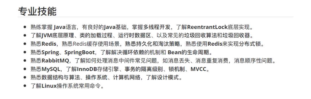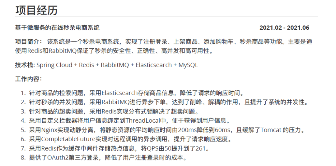 首先是专业技能这块,不再是简简单单的对某个技能写了解或者熟悉,而是加入的很多支撑数据,这些数据随便每个展开都可以和面试官进行对线。