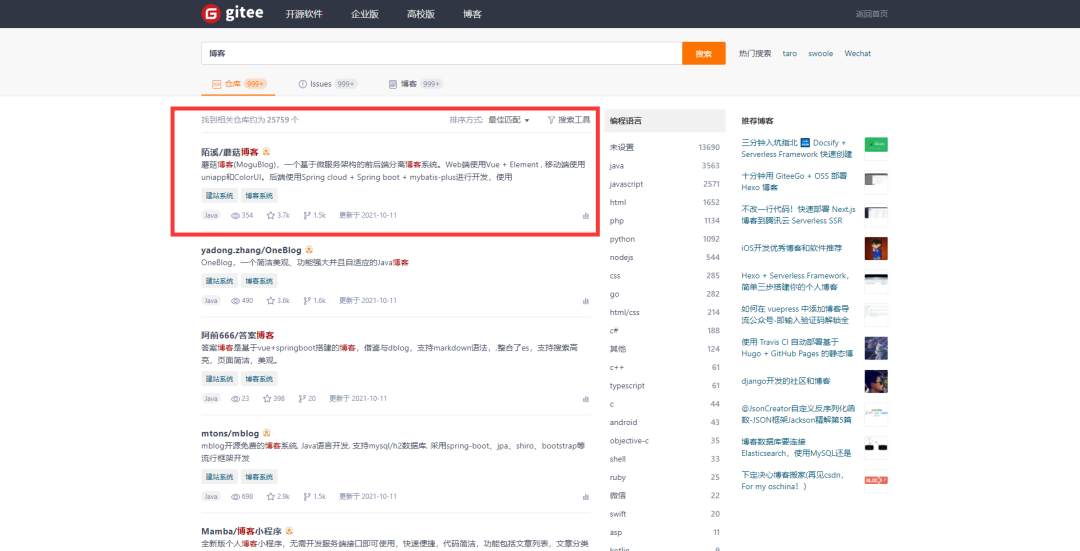 我与陌溪结缘起始于 Gitee 上的一次寻找博客项目,那会通过 Gitee 的搜索功能,输入 博客 关键字,找到的第一个就是蘑菇博客,那会看到蘑菇博客的技术栈也是最新的,并且里面的技术大部分都学习过,可以说非常符合自己的口味。