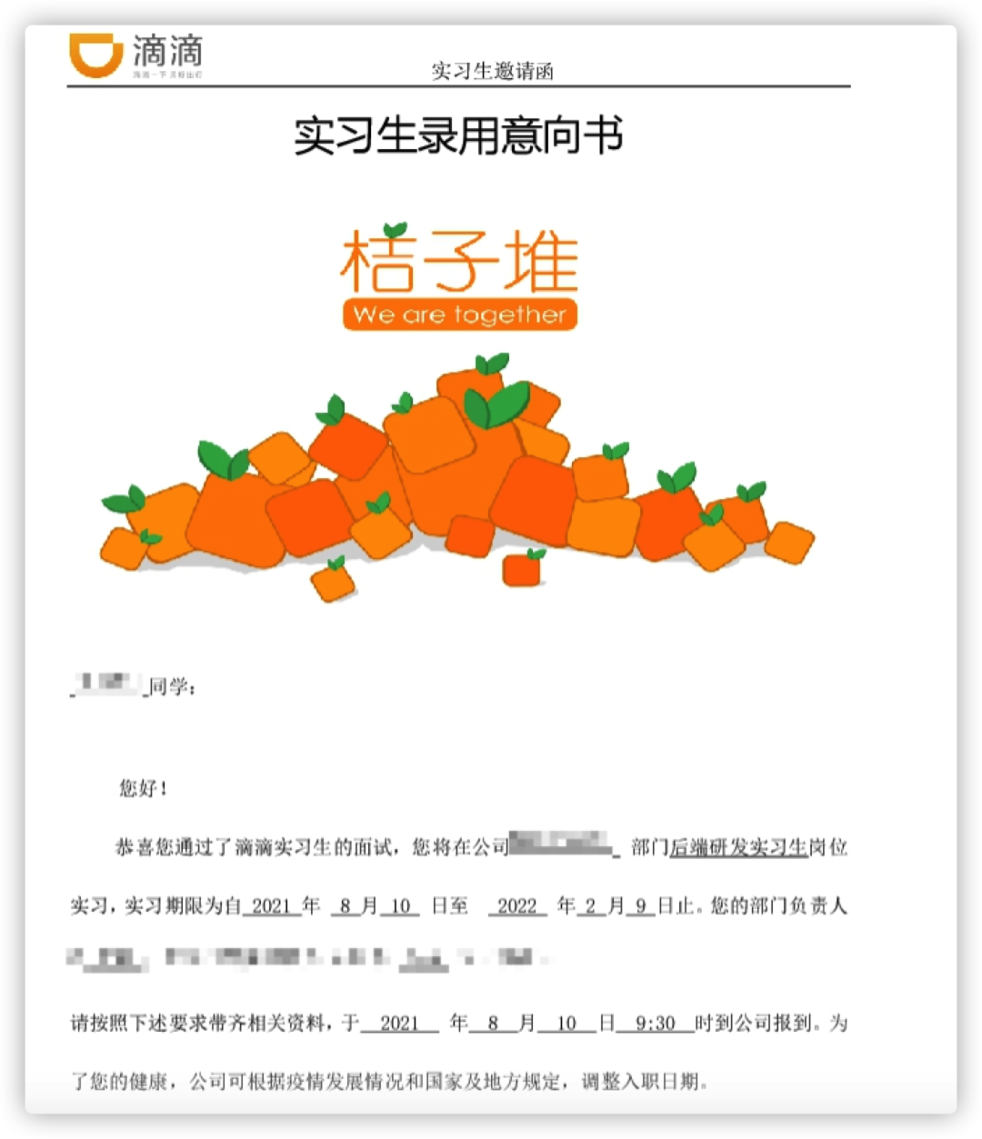 在 8 月份的时候,面试了 滴滴出行 和 字节跳动 的实习岗位,并且成功拿到了 实习Offer,但是公司要求立即到岗实习,并且我们学校大四还需要返校上两个月课才可以出去实习,所以无缘去进行实习了。