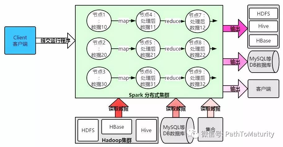 我们在本地编写了 spark 程序,然后你必须在某台能够连接 spark 的机器上提交该 spark程序。此时他会去Hadoop集群或者其他类型的数据库读取数据,数据会存储在spark分布式集群上。