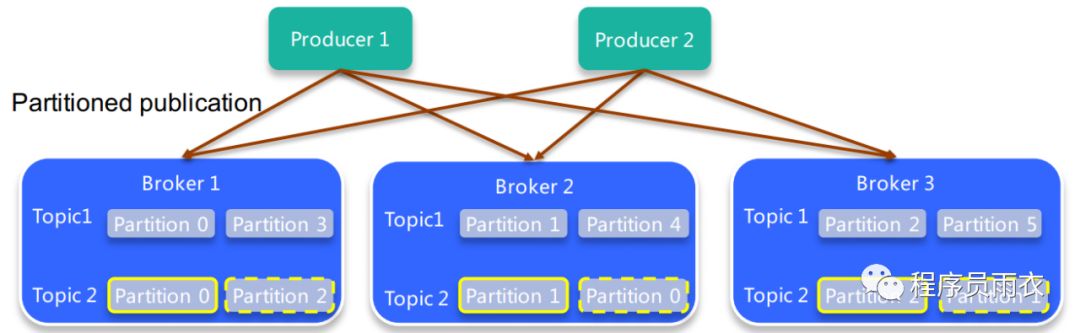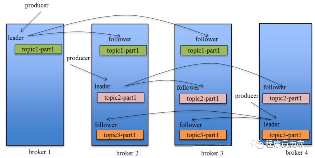 当某个Topic的replication-factor为N且N大于1时,每个Partition都会有N个副本( Replica)Replica的个数小于等于Broker数,即对每个Partition而言每个Broker上只会有一个Replica,因此可用Broker ID表示Replica所有Partition的所有Replica默认情况会均匀分布到所有Broker上