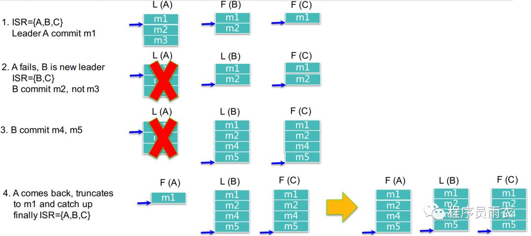 ISRLeader会维护一个与其基本保持同步的Replica列表,该列表称为ISR( in-sync Replica)如果一个Follower比Leader落后太多,或者超过一定时间未发起数据复制请求,则Leader将其从ISR中移除当ISR中所有Replica都向Leader发送ACK时, Leader即CommitCommit策略Server配置replica.lag.time.max.ms=10000replica.lag.max.messages=4000Topic配置min.insync.replicas=1Producer配置request.required.acks=0
