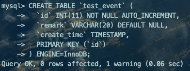CREATE TABLE `test_event` ( `id` INT(11) NOT NULL AUTO_INCREMENT, `remark` VARCHAR(20) DEFAULT NULL, `create_time` TIMESTAMP, PRIMARY KEY (`id`)) ENGINE=InnoDB;