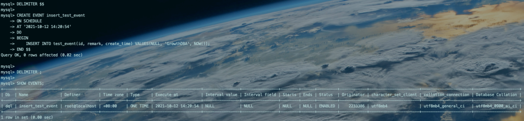 DELIMITER $$CREATE EVENT insert_test_eventON SCHEDULEAT '2021-10-12 14:20:54'DOBEGIN INSERT INTO test_event(id, remark, create_time) VALUES(NULL, 'GrowthDBA', NOW());END $$DELIMITER ;SHOW EVENTS;