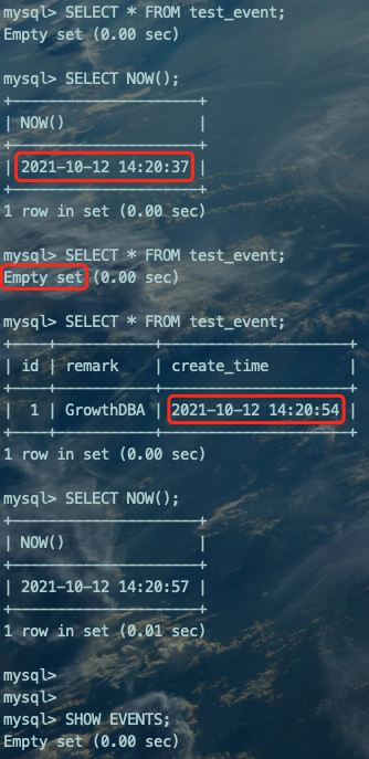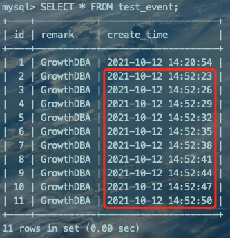 DELIMITER $$CREATE EVENT insert_test_event_3sON SCHEDULEEVERY 3 SECOND STARTS '2021-10-13 00:00:00' ENDS '2021-10-13 23:59:59'DOBEGIN INSERT INTO test_event(id, remark, create_time) VALUES(NULL, 'GrowthDBA', NOW());END $$DELIMITER ;