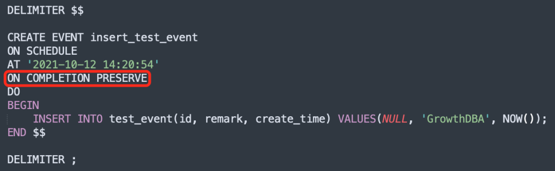 DELIMITER $$CREATE EVENT insert_test_eventON SCHEDULEAT DATE_ADD(NOW(), INTERVAL 2 DAY)DOBEGIN INSERT INTO test_event(id, remark, create_time) VALUES(NULL, 'GrowthDBA', NOW());END $$DELIMITER ;