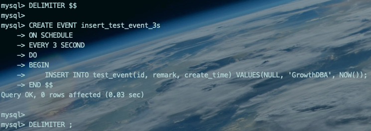 DELIMITER $$CREATE EVENT insert_test_event_3sON SCHEDULEEVERY 3 SECONDDOBEGIN INSERT INTO test_event(id, remark, create_time) VALUES(NULL, 'GrowthDBA', NOW());END $$DELIMITER ;
