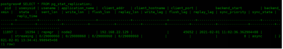 服务启动以后,我们去主节点查看是否建立了流复制模式,可以看到主备已经处于同步状态。