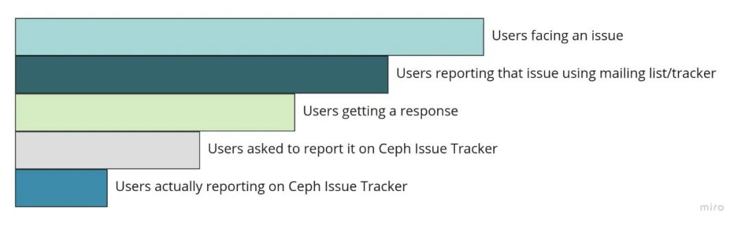 用户的工作流程中断。他们必须从一个站点收集相关信息并访问另一个站点以创建新问题。漏斗减少 当用户遇到问题时,他/她通常会联系 ceph 用户或开发人员邮件列表来询问相同的问题。并非所有用户都得到回复。假设在 100 个用户报告中,只有 75% 得到回复(粗略数字,仅用于解释)。在得到回复的 75 人中,约有 50 人被要求在 Ceph 问题跟踪器上创建一个新问题。在那些被要求创建问题的人中,由于这个过程的每个阶段的不便,并不是所有的人最终都会访问 Ceph 问题跟踪器。因此,最终报告问题的用户数量非常少。我们可以使用下图更好地理解这一点: