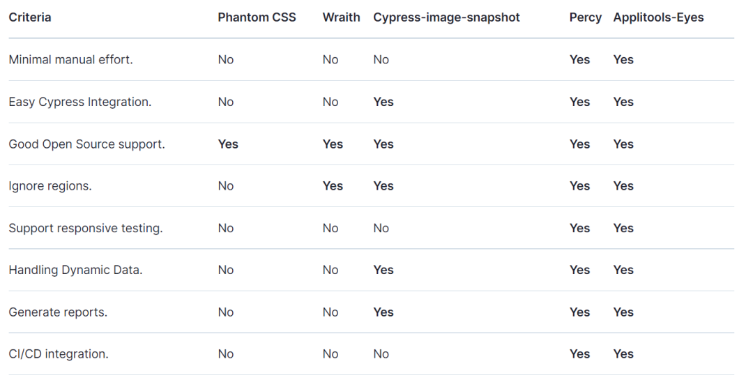 我项目的主要任务之一是为视觉回归测试选择最佳工具。为此,我提出了一个判断各种工具的标准,它是: