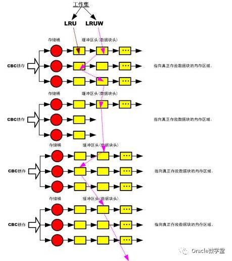 >> 除了散列表之外,缓冲区头也被链接到其他的列表,例如:LRU、LRUW、CPKT-Q,LRU列表包含各种状态的缓冲区,而LRUW列表只包含脏缓冲区。LRU和LRUW列表是相互排斥的。一对LRU+LRUW称为一个工作集(working set)。每个工作集由一个cache buffers lru chain锁存器保护(即:一个工作集有一个cache buffers lru chain锁存)。