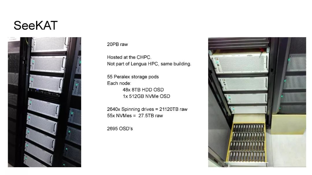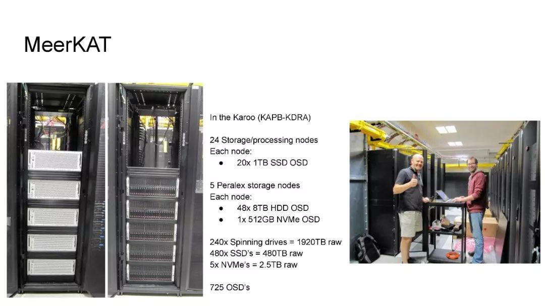 在本次演讲中,Martin将介绍MeerKAT数据存档中使用的硬件,软件栈,部署和操作工具。MeerKAT目前有两个Ceph集群,一个在干旱的卡鲁望远镜现场,另一个在开普敦的大集群,其中开普敦群集包括2640个硬盘和55个NVMe设备。Karoo集群包含240个硬盘和480个固态硬盘。