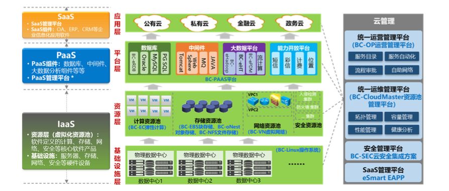 移动苏研可提供整体的云解决方案,供公有云、私有云、金融云、政务云等场景使用,目前可以覆盖:IaaS & SaaS应用、运营和运维管理平台、安全管理平台、SaaS管理平台等。