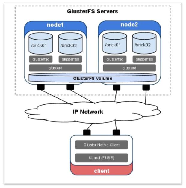基于glusterfs深度定制开发的分布式文件存储集群,可提供传统NAS、云化NAS等服务,可以满足常规NAS、容器存储等多种使用场景,其架构图如下: