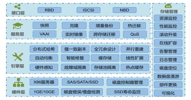 基于ceph深度定制开发的分布式块存储集群,可提供RBD、iSCSI、NBD等多种访问接口,可以满足KVM、VMware、Xen、Baremetal、K8S等多种使用场景,其架构图如下: