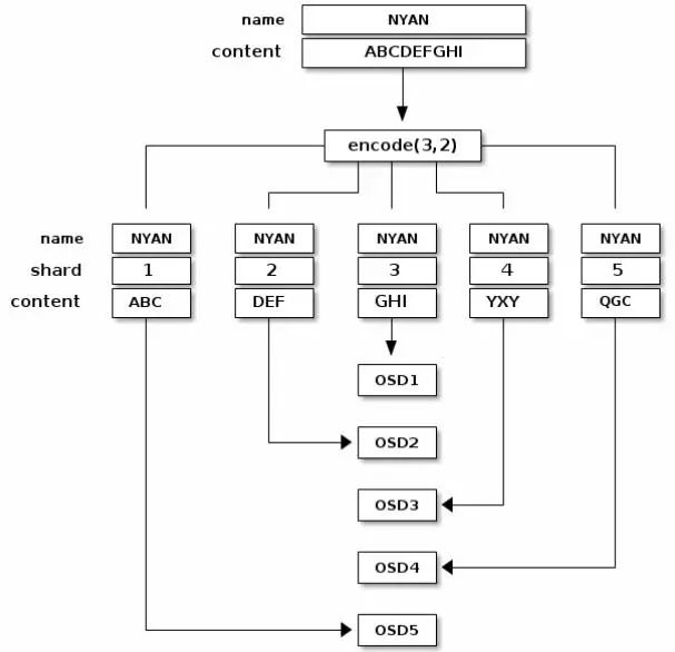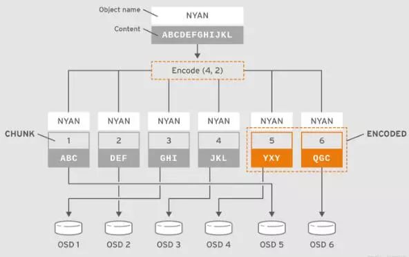 将对象写入纠删码存储池中的时候(比如对象名叫 NYAN , 内容为 ABCDEFGHI )纠删码计算函数会将对象的内容按长度平分成3个块(即,分成K个数据块),第一个块内容为 ABC , 第二个块内容为DEF , 第三个块内容为 GHI , 如果块内长度不是 K 的倍数,那么平分后最后的一块所剩余的空位就会进行填充以使其长度为K(比如内容串为ABCDEFGHIJ, 则3个数据块内容依次为ABCD, EFGH, IJ..,最后的IJ长度不够就会填充);除了将内容按K切分外, 纠删码函数也要创建另外2个编码块,即第4个块内容为 XYZ ,第5个块内容为 GQC 。这里的每一个块内容都对应Action Set列表中的一个OSD。 这些块有相同的名称都叫 NYAN , 但块存在不同的OSD中。除了名称之外,数据块创建的对应序号需要存储在对象的属性中( shard_t ) 。 包括 ABC 内容的第一个块存储在 OSD5 上,而包括 YXY 内容的第4个块则存储在 OSD3 上。